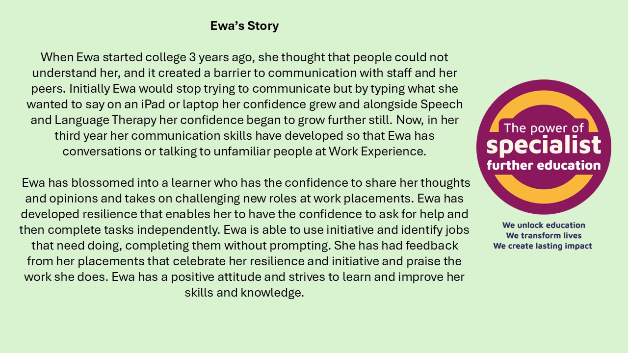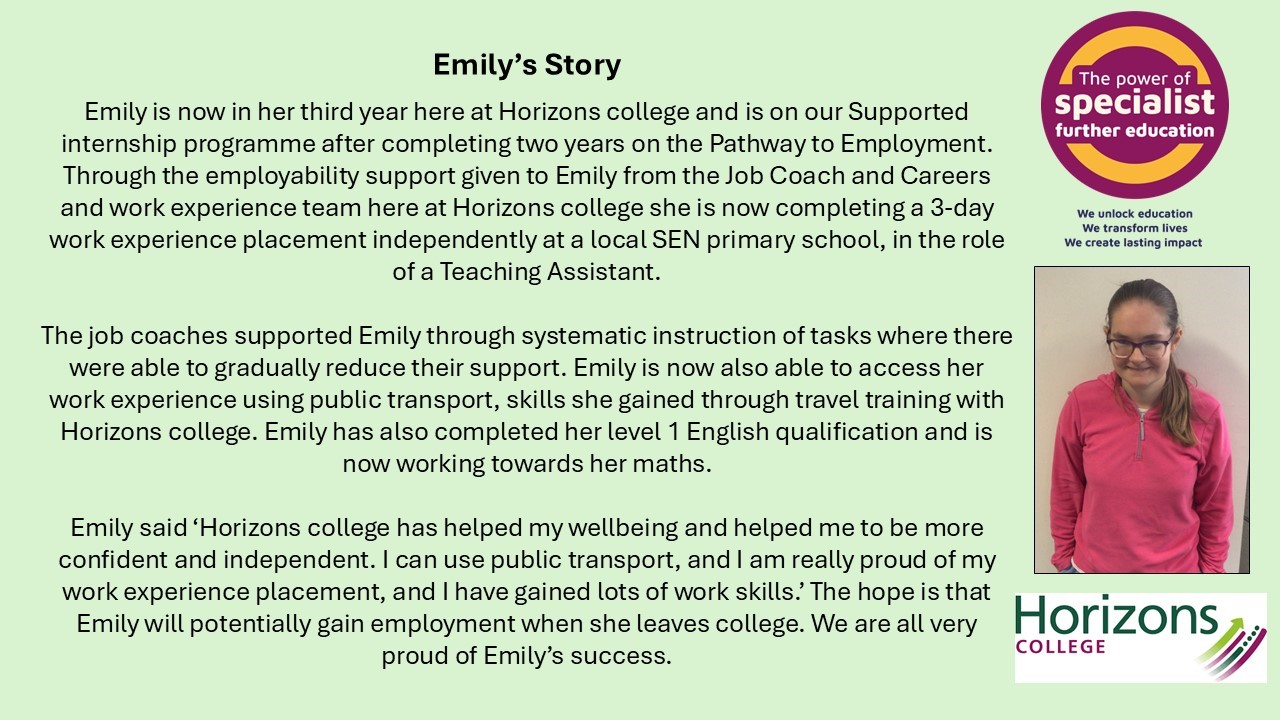 In support of NATSPEC and their Power of Specialist Further Education campaign, Horizons College have been sharing some of their learner success stories. It is fantastic to see so many of our young people achieving so much. We would like to share some of these stories with you below. To read more, please follow the link to the Horizons College website